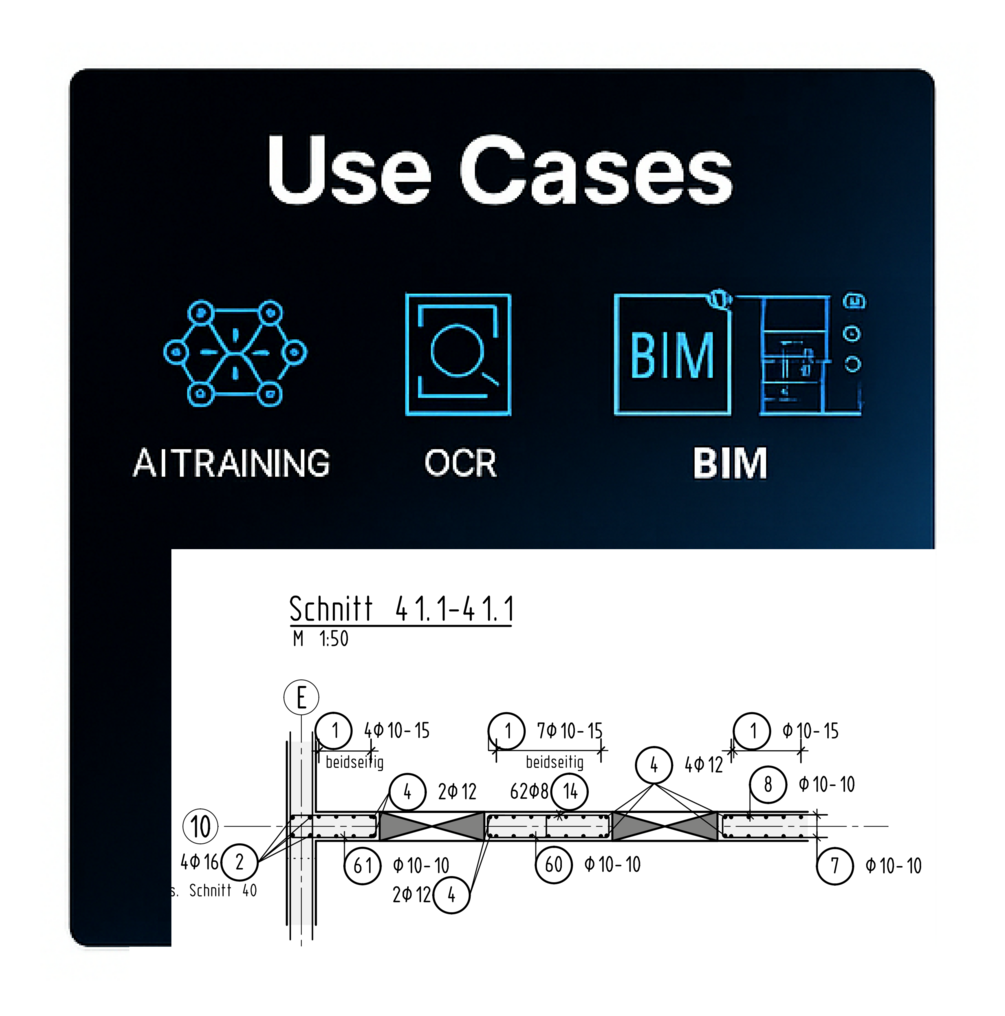 AI training, OCR models, BIM automation, research, software development, commercial use inside your own tools or models.