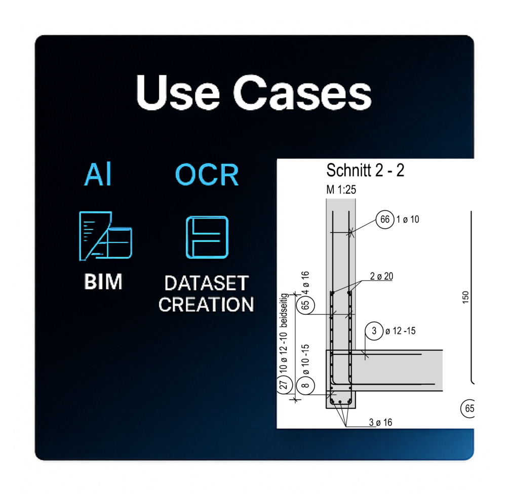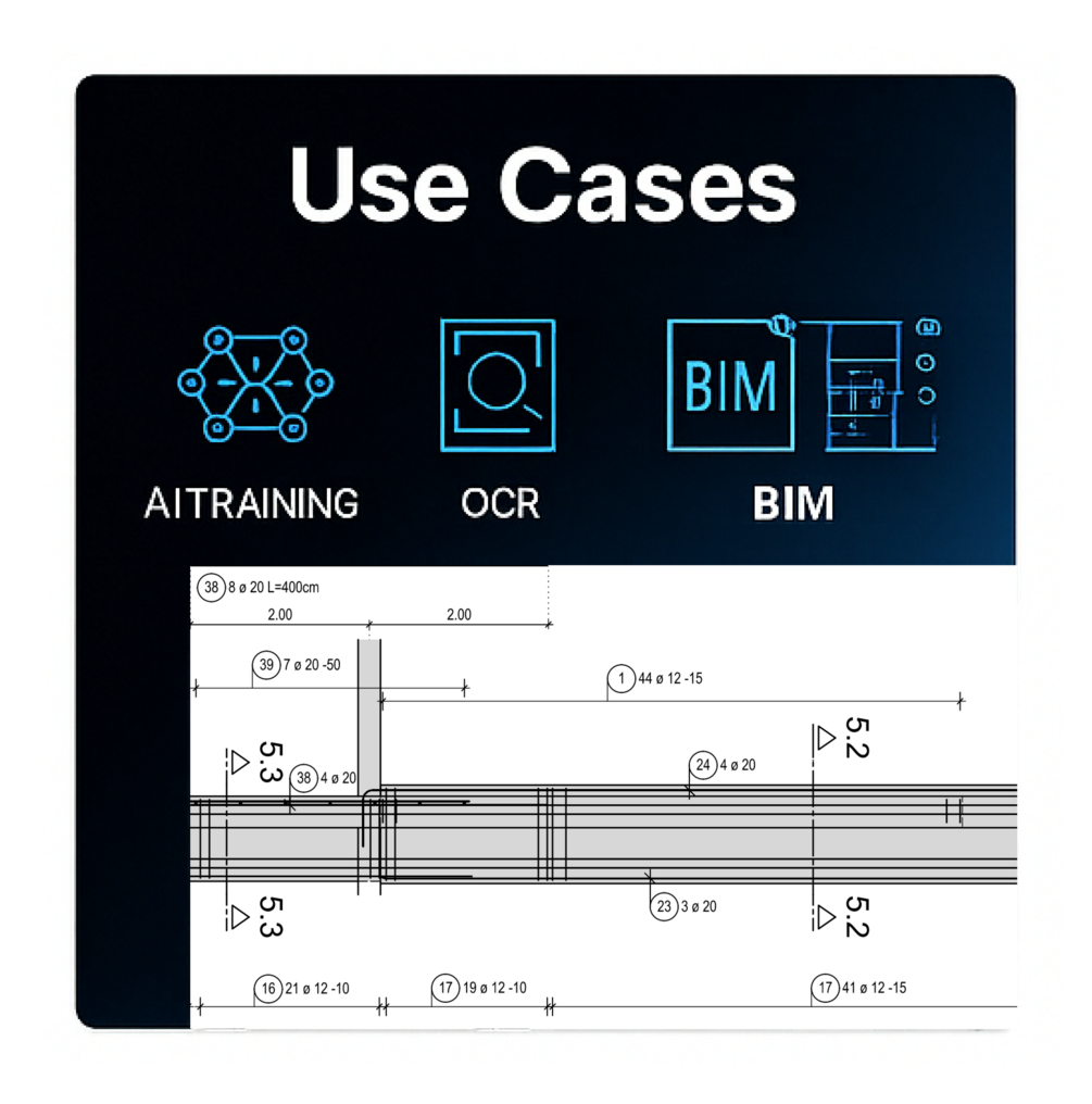 AI training, OCR models, BIM automation, research, software development, commercial use inside your own tools or models.